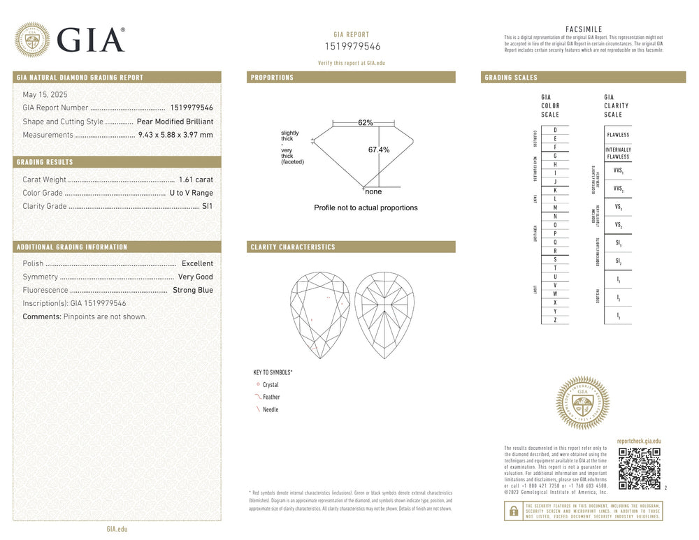 GIA Certified 1.61 CT Pear Diamond U to V Range Color Natural Diamond (9.43 MM)