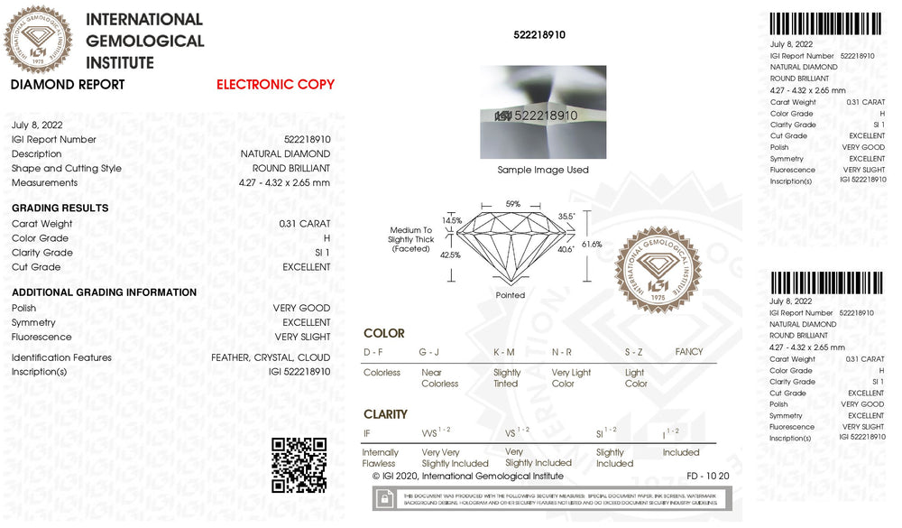 IGI Certified 0.31 CT Round Diamond White(H) Diamond Natural Loose Diamond SI1 Clarity (4.32 MM)